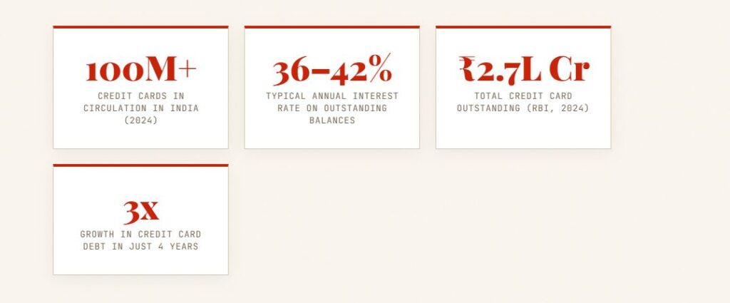 His two credit cards carry a combined outstanding of ₹2.4 lakh. At an annualized interest rate of 36–42%, he’s paying nearly ₹8,000 a month just in interest. He has not touched the principal in seven months. He is not alone.