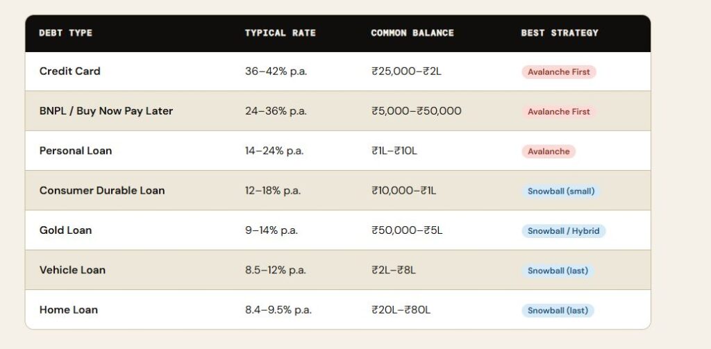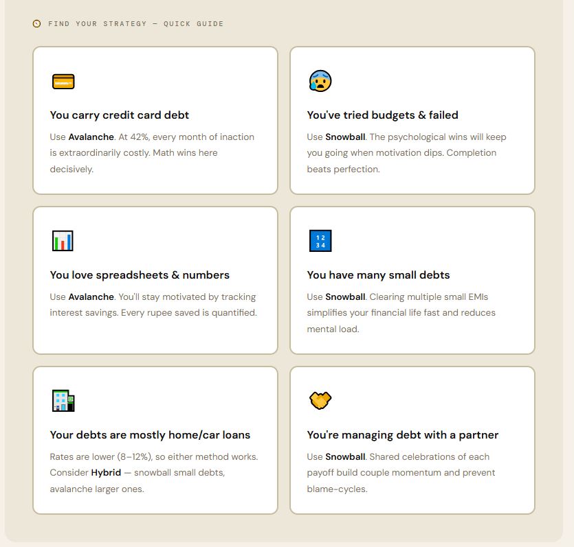 For most Indian borrowers: Start with Avalanche if you have credit card or BNPL debt — the 36–42% rates make it mathematically non-negotiable. Switch to Snowball psychology for small sundry debts. Use a Hybrid approach for long-term motivation. And above all — any consistent strategy beats no strategy by years and lakhs.