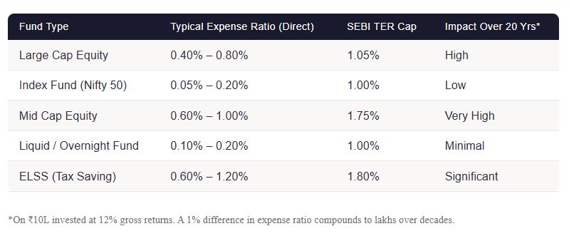 The expense ratio is the annual fee deducted from the fund’s assets to cover management, administration, and distribution costs. It is expressed as a percentage and is deducted daily from NAV — you never see it as a separate charge, which is why it’s easy to ignore. Don’t ignore it.