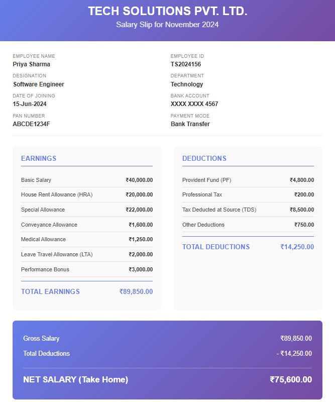 Let’s walk through a sample salary slip to understand each component. Meet Priya, a software engineer in Bangalore with a CTC (Cost to Company) of ₹12,00,000 per annum.